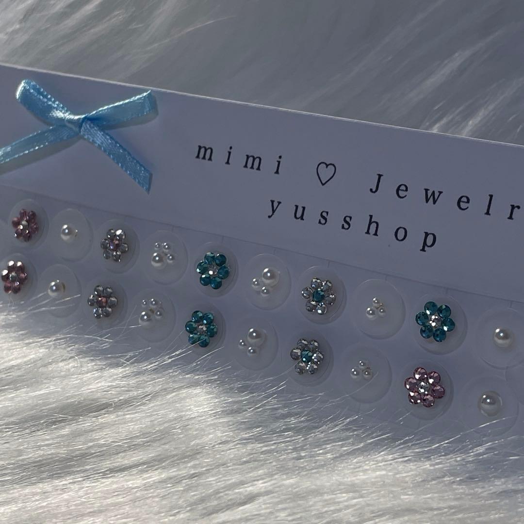 M46♡耳つぼジュエリー お花 スワロフスキー ピンク 水色 春夏 キラキラ ブルー 大人可愛い 小粒 パール 韓国デザイン 上品 ニュアンス お呼ばれアクセサリー 成人式 前撮り お出かけ ブライダル