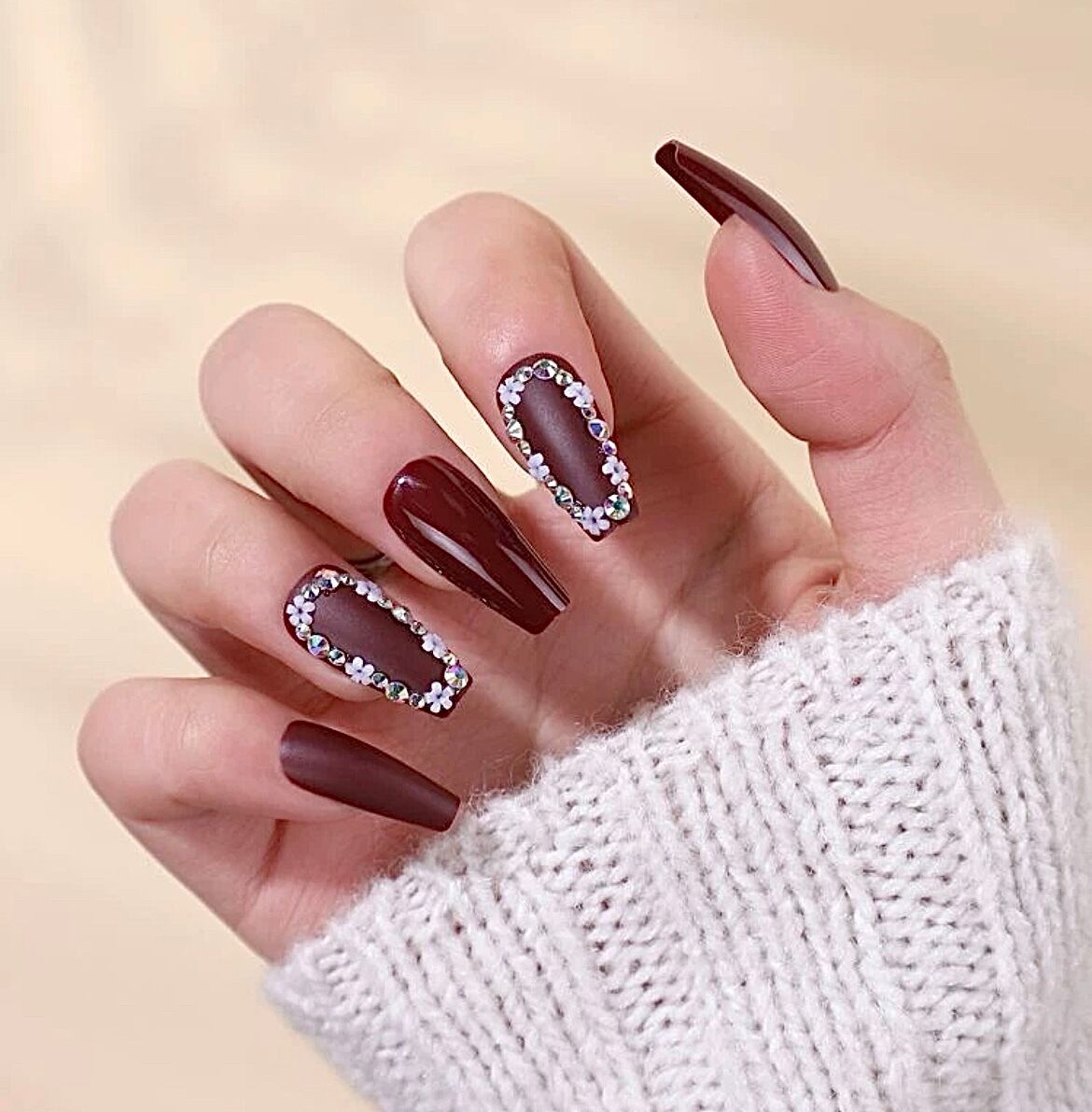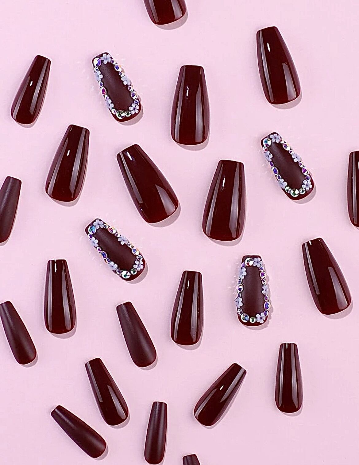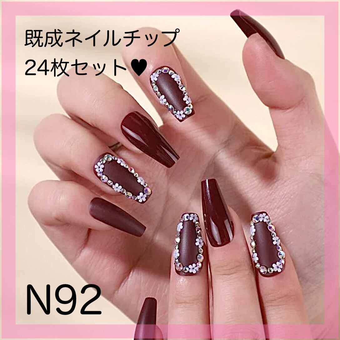 《N92》既成ネイルチップ24枚セット ボルドー 赤 囲みストーン 花 マット